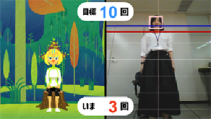 「起立の森」では、カメラによる顔認識と距離センサーによる距離の測定により、プレイヤーの動きを検知し画面を変化させ、椅子から立ったり座ったりの起立運動をサポートします。